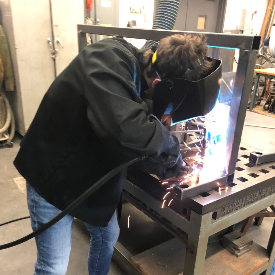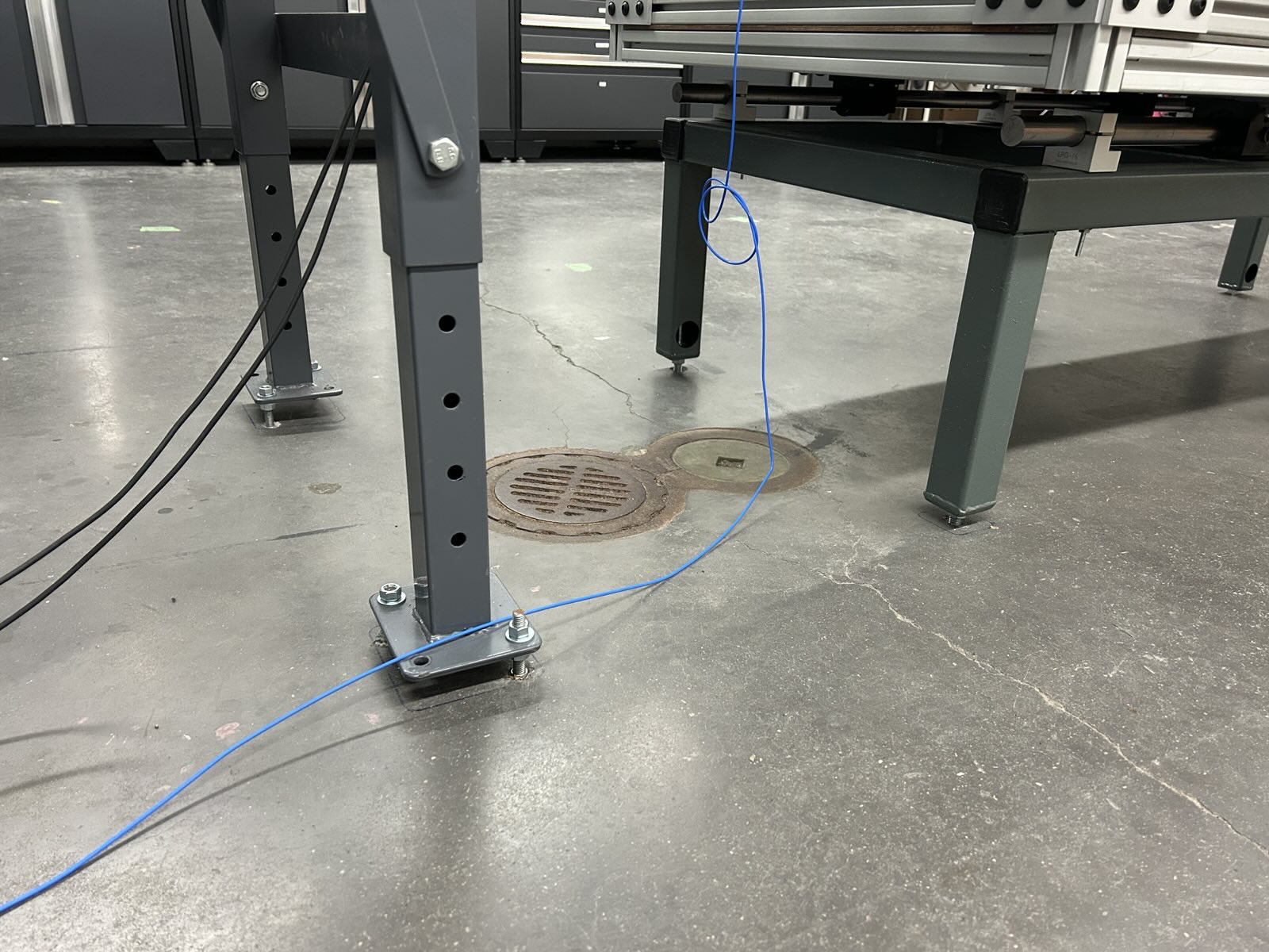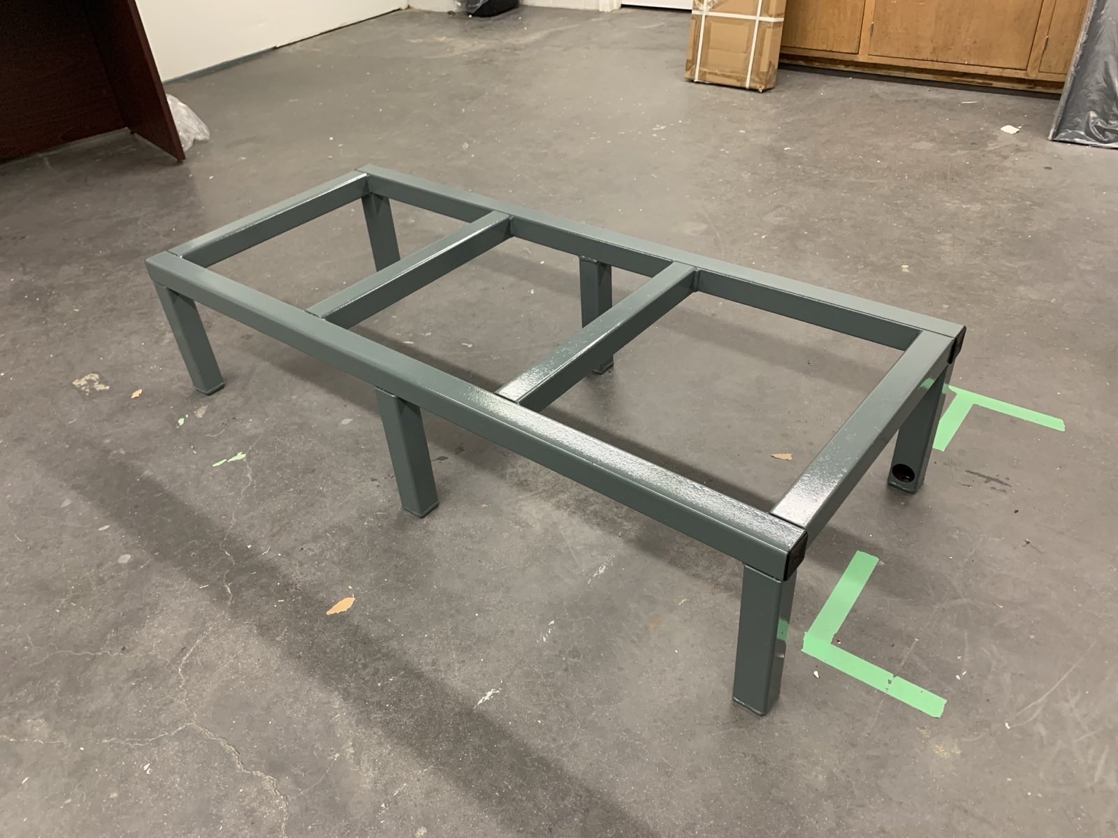 We presented our design to our supervisor, and after some slight tweaks we began manufacturing. We built the specimen chamber support out of two-inch square steel tube, which we ordered to size and then welded ourselves. We also painted the structure with a rust-proof coating. The floor of the new lab space was uneven, so we designed the entire structure with adjustable leveling feet that anchored to the concrete floor.