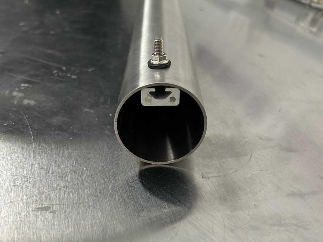 One of the more interesting parts of the new design was the two-inch tube modified to restrict projectile rotation, which we referred to as the "keyed tube". We accomplished this by installing a 10mm wide aluminum extrusion on the inside of the tube. To install the extrusion we needed to drill holes along the length of the tube, which we did using a milling machine to ensure the holes were perfectly aligned. We installed the extrusion using rubber washers to prevent any air leakage. A new projectile was designed with a corresponding cross-section, which would ride along the extrusion.