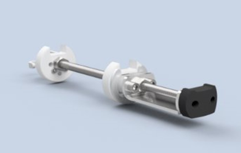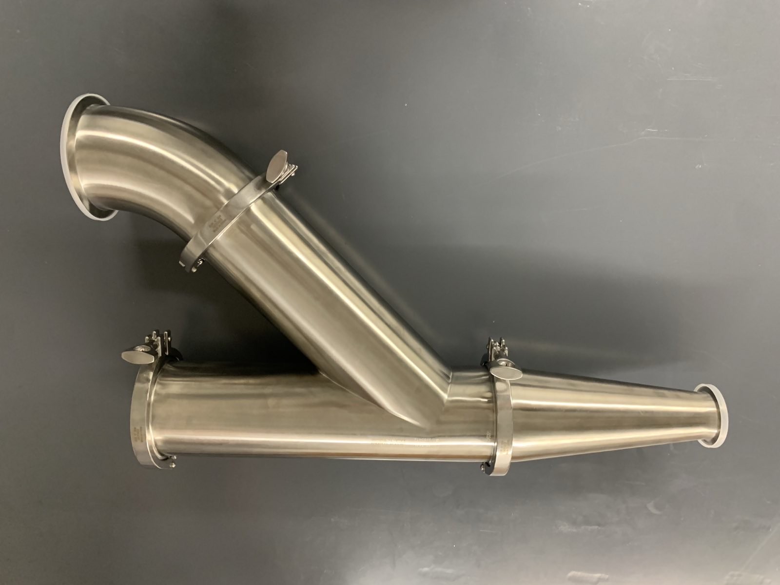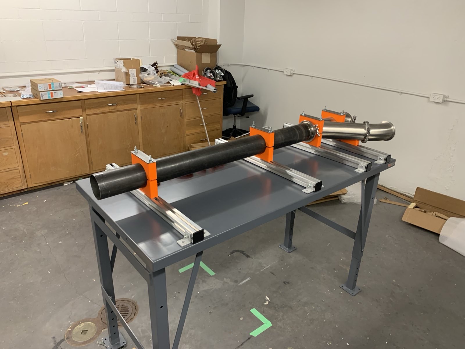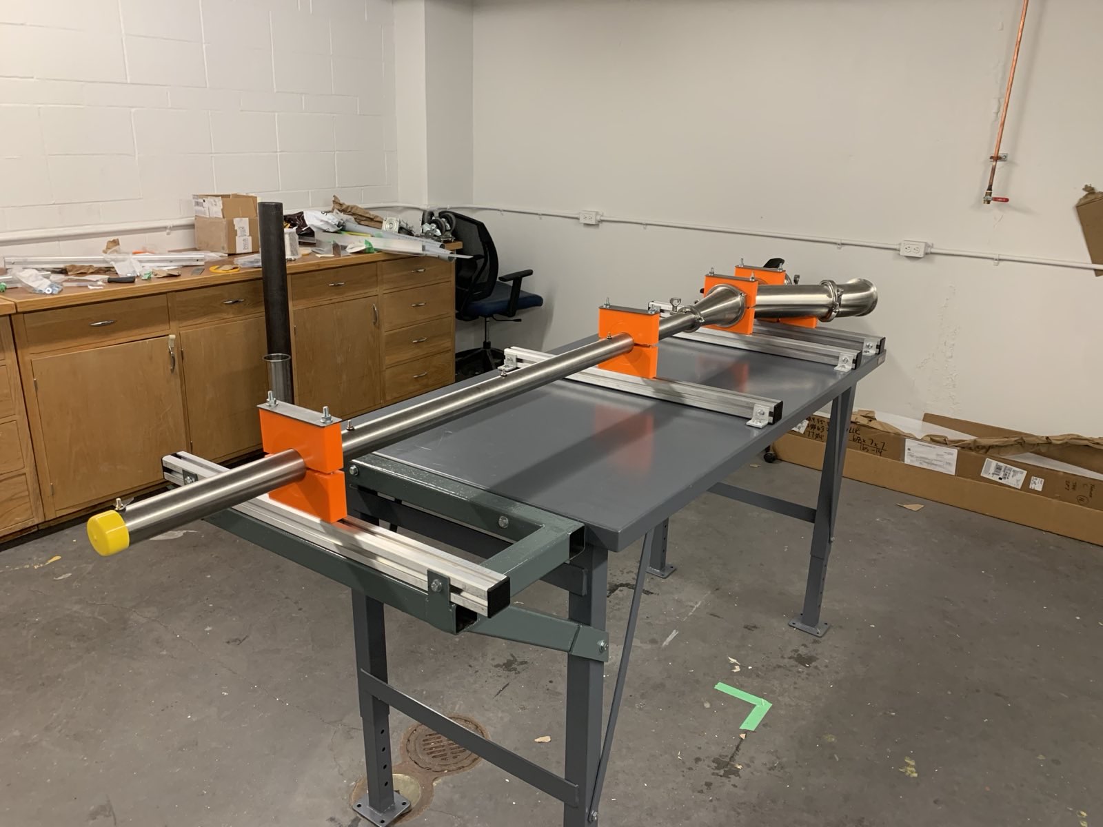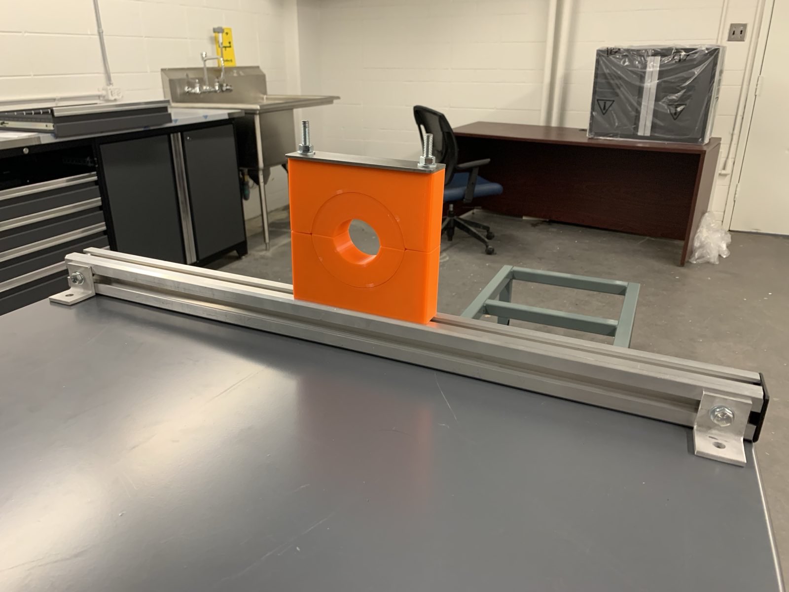 The adjustable tube clamp system was made of custom 3D-printed clamps that slide along a length of aluminum extrusion. The inner diameter of the clamps is four inches, and inserts can be used to reduce the diameter to accomodate the smaller tubes. The clamp components were printed nearly solid, and we manufactured steel retainers to hold everything in place. We also engraved the aluminum extrusions with a ruler, making it much easier to position the tube.