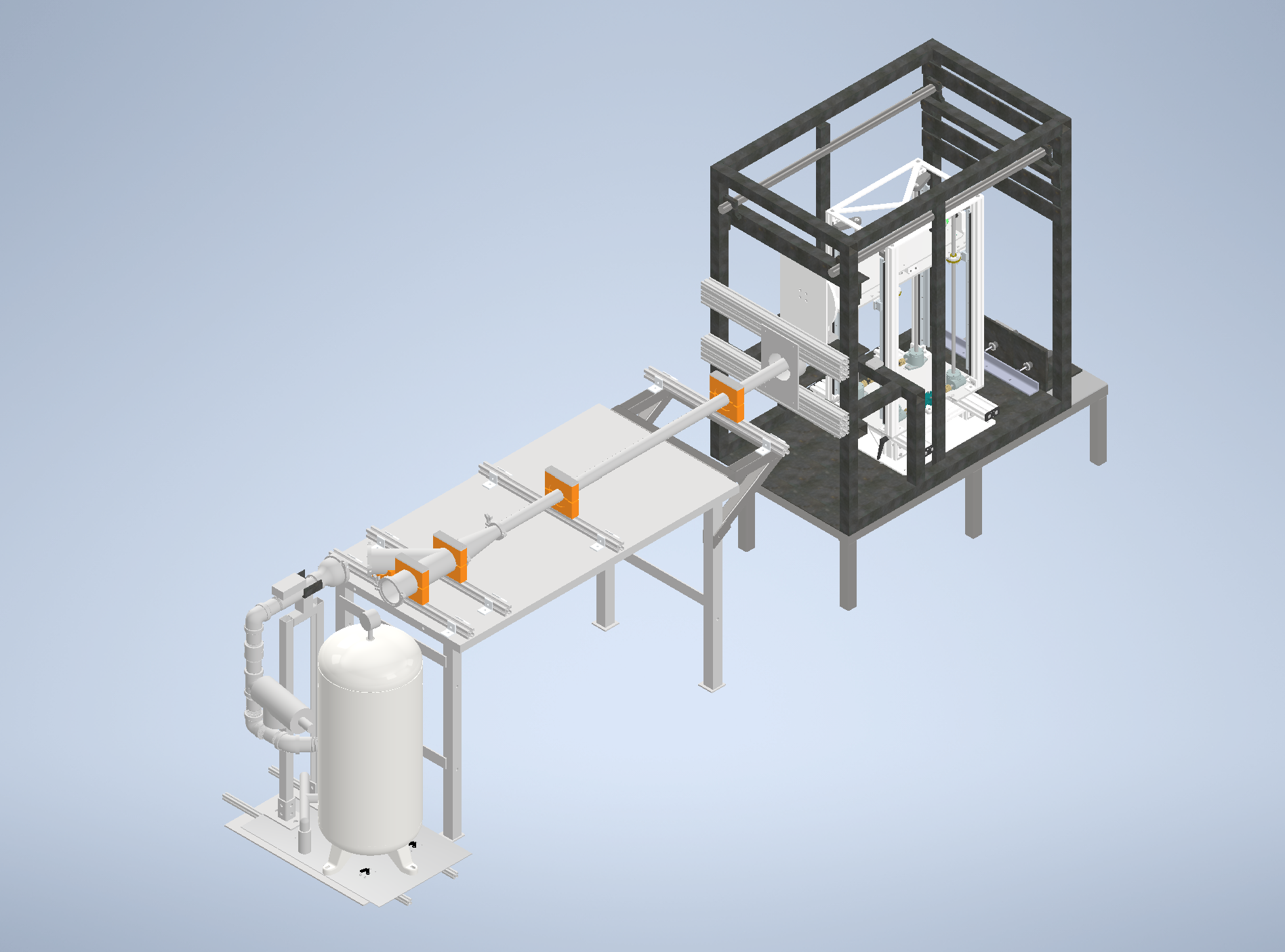 We got to work designing, proposing, and redesigning. After several months of iterating we had a solution that addressed each of the previously outlined concerns. The new apparatus would be a combination of existing pieces, machined parts, and off-the-shelf components. For our design, we lowered the acceleration tube to table height, and we designed a custom steel structure to support the specimen chamber. We also designed an adjustable clamp system to fasten the tube to the table. The clamps would be compatible with the existing three-inch and four-inch tubes, as well as with a new two-inch tube. To solve the projectile rotation issue, we customized the new tube with an internal keyway (made from aluminum extrusion), and a corresponding projectile was designed. A wye-fitting allowed us to separate the compressed air intake from the projectile loading port. We also designed a platform to extend the length of the table.